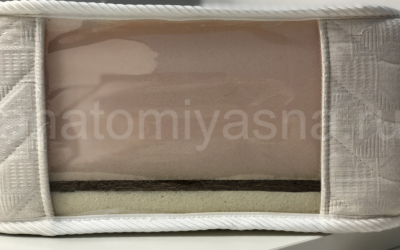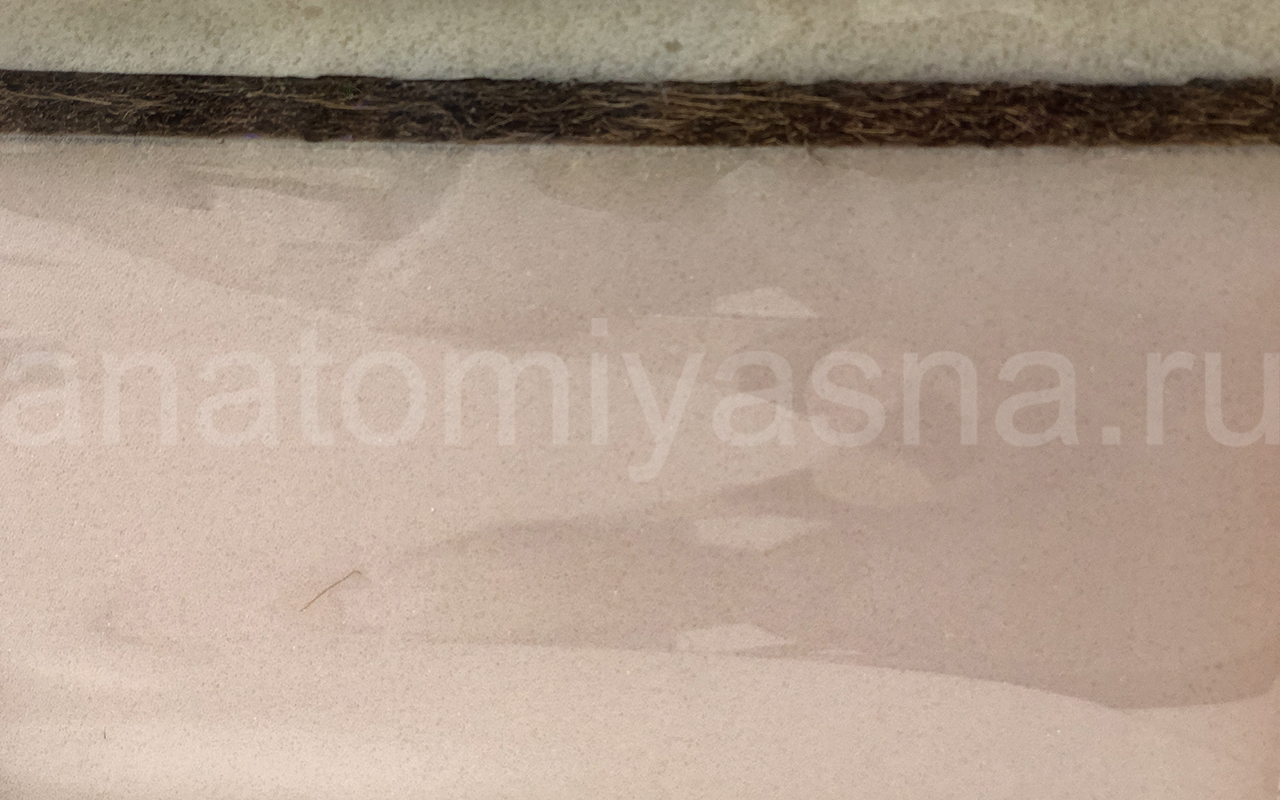 Наличие кокосового волокна толщиной 1 см. в составе придает матрасу жесткость, обеспечивает дополнительную поддержку позвоночника во время сна, формирует ортопедический эффект.